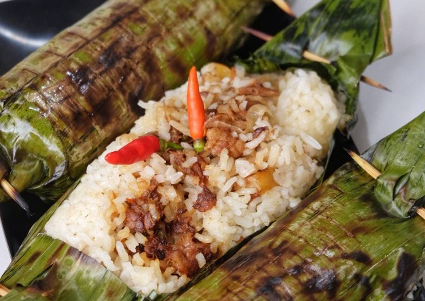 Saya selalu suka citarasa nasi bakar, aroma daun hangus itu menambah cita rasa nasi.
