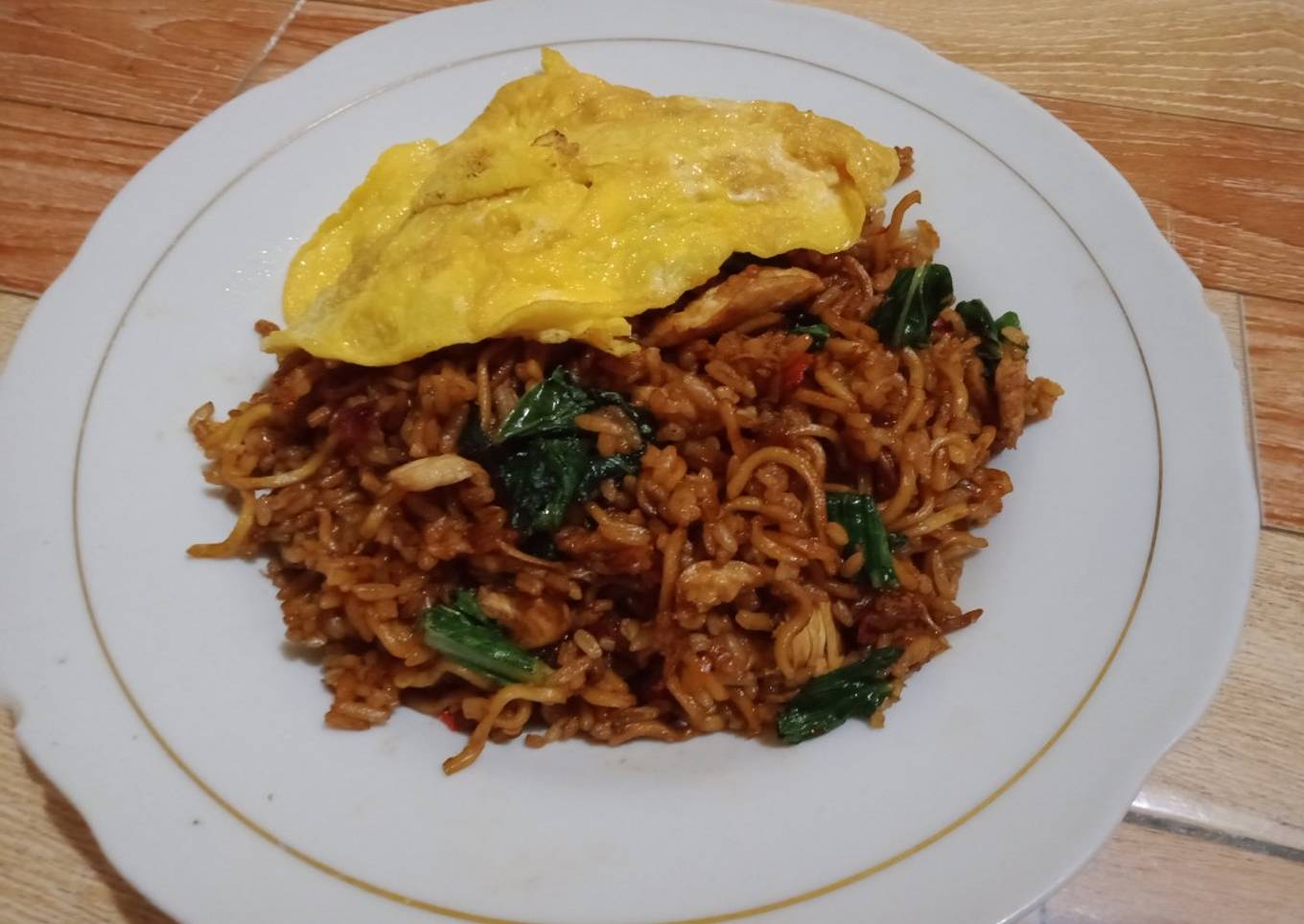 - Panaskan wajan/ pan masukkan bumbu biarkan sampai wangi dan tambahkan ayam yg sudah disuwir, mie, nasi & sawi ijo (aduk" sampai tercampur rata)