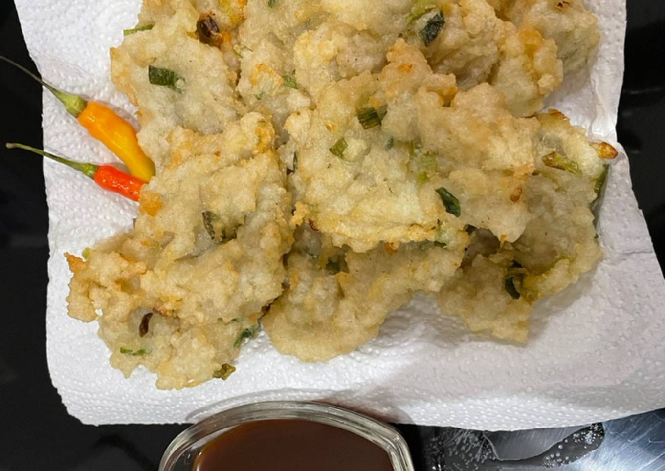 - Angkat dan sajikan dengan saus. Karena di kulkas ada sisa cuko pempek, saya pakai ini untuk cocolan..