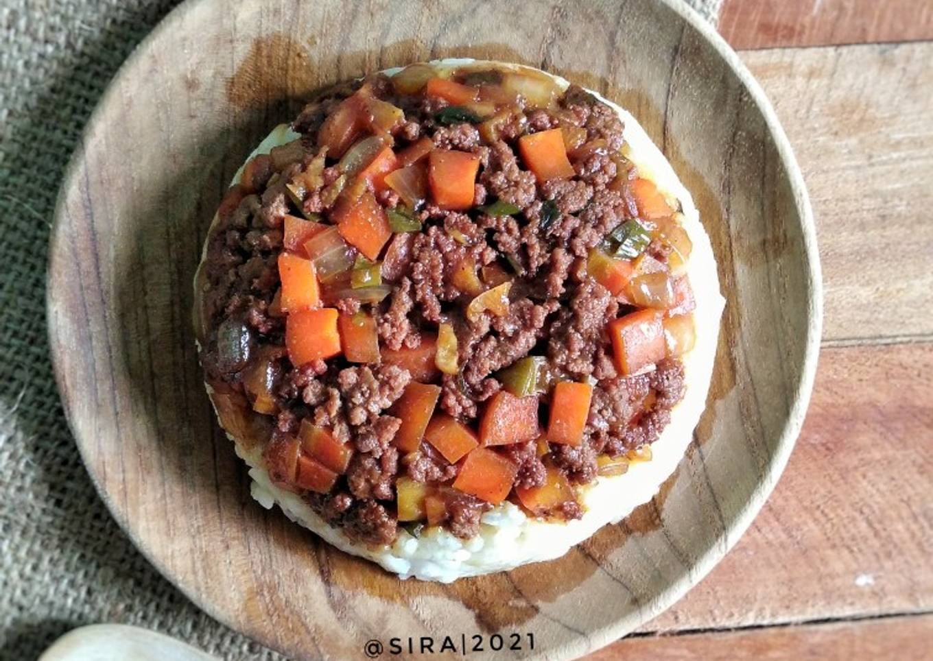 - Siapkan semua bahan. Tumis bawang putih, bawang bombay, wortel, daun bawang dan daging cincang. Masukkan semua bumbu lainnya. Tambahkan sedikit air. Masak hingga air surut.