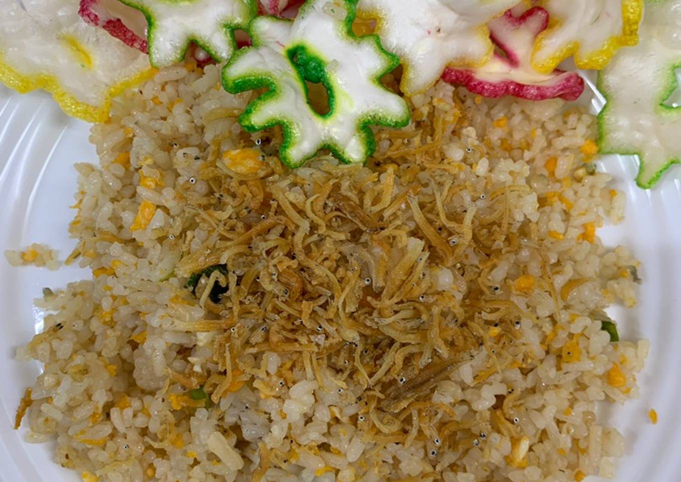 - Tata nasi goreng diatas piring, boleh dikasih garnish salada air, tomat, timun, kerupuk, lalu taburkan ikan teri yang sudah digoreng tadi, sajikan.