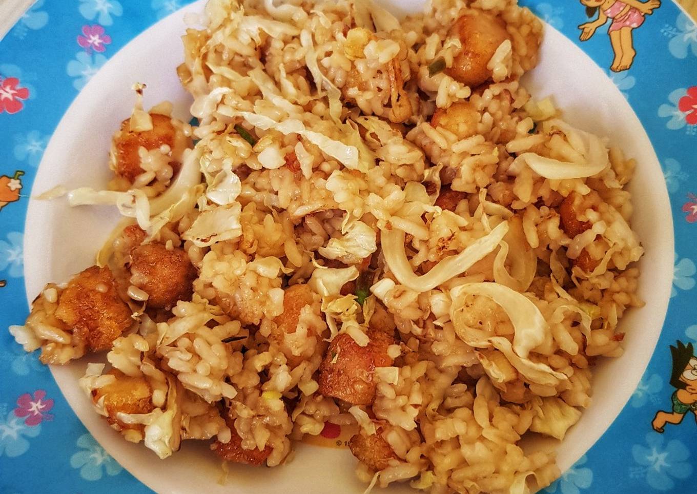- Masukkan nasi putih, kubis, kecap, dan garam
