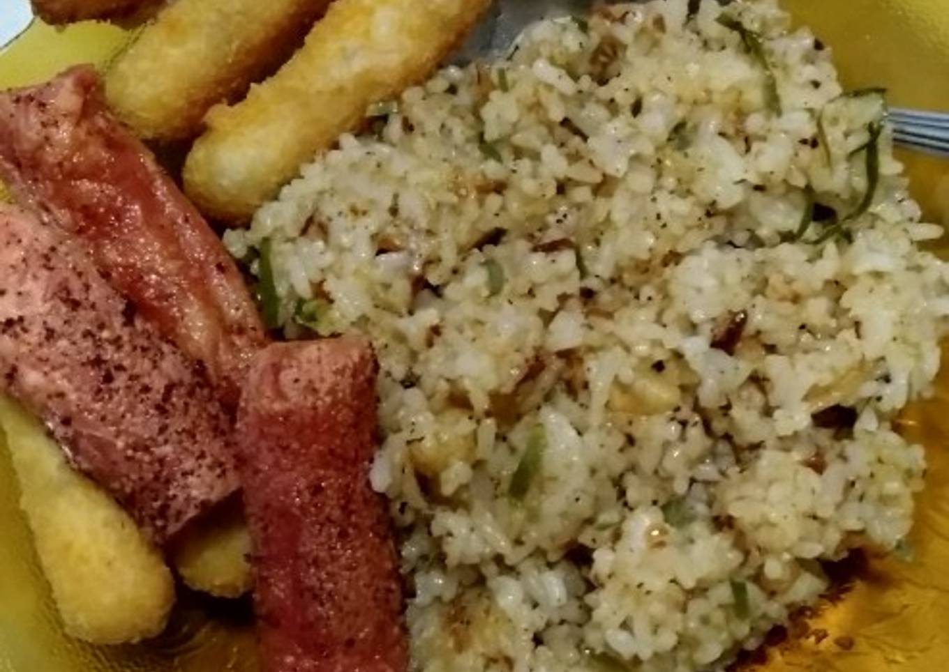- Setelah harum masukan nasi, lalu aduk sampai rata sambil masukan lgi mentega 1 sdm lalu aduk dan beri bumbu penyedap rasa, garam, dan lada. Lalu koreksi rasa dan setela pas angkat dan sajikan.