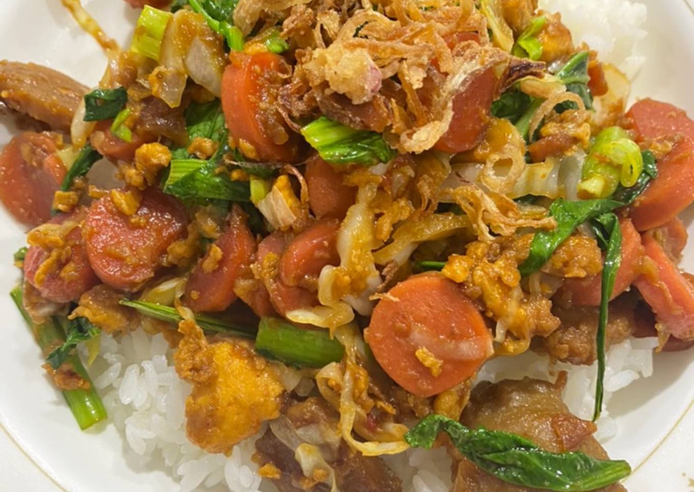 - Sajikan diatas nasi putih dan beri secukupnya bawang goreng.