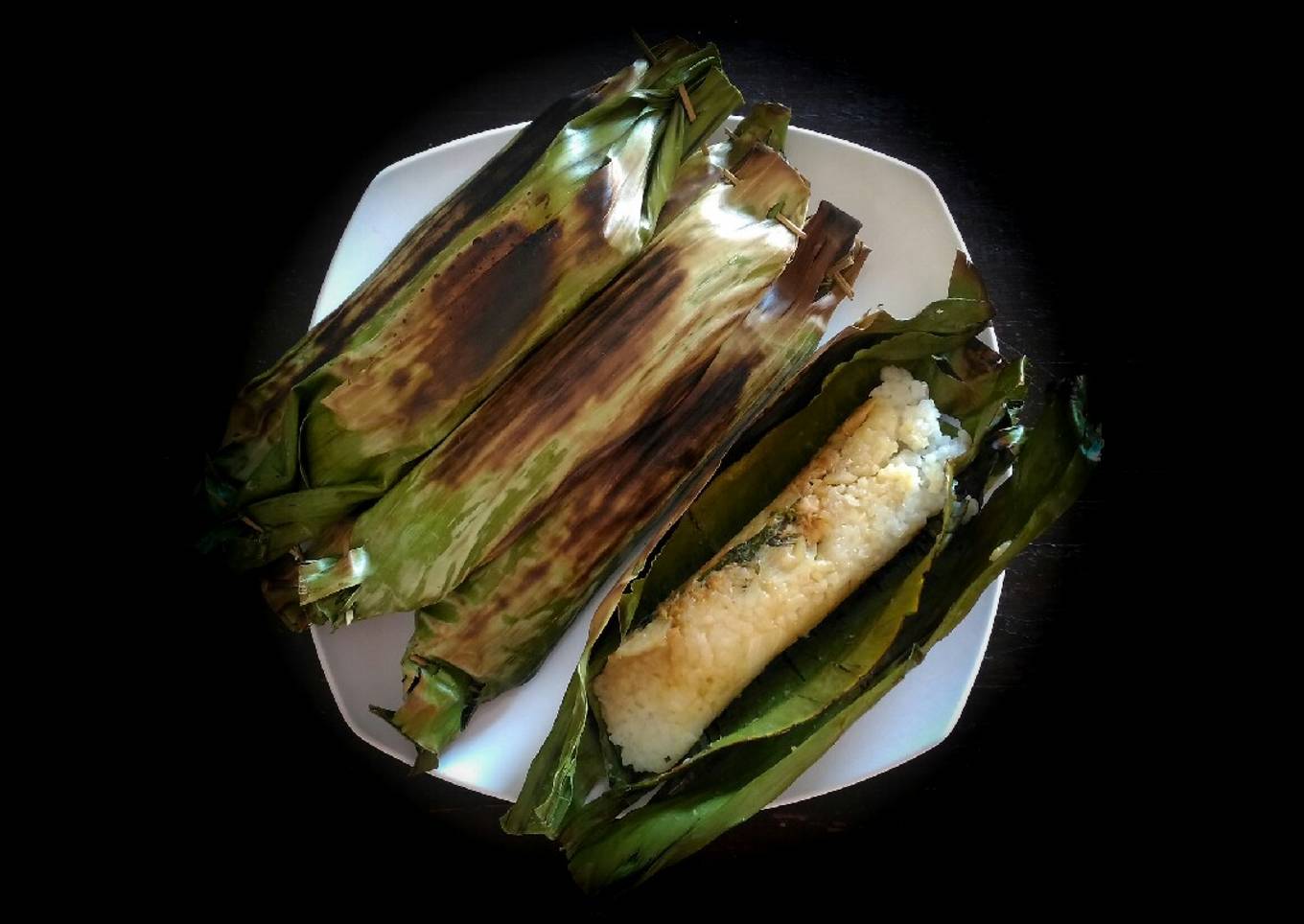 - Siapkan panggangan dan panggang hingga daun pisang kering.
