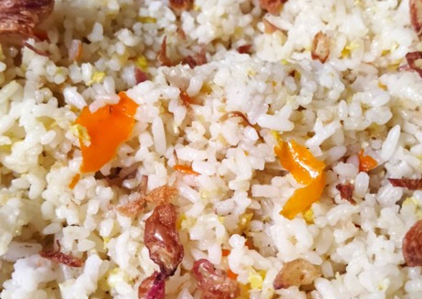 - Panaskan minyak, tumis bumbu halus sampai harum, kmdn masukkan 2 butir telur & nasi. Lalu aduk sampai rata. Beri garam& kaldu jamur. Koreksi rasa.