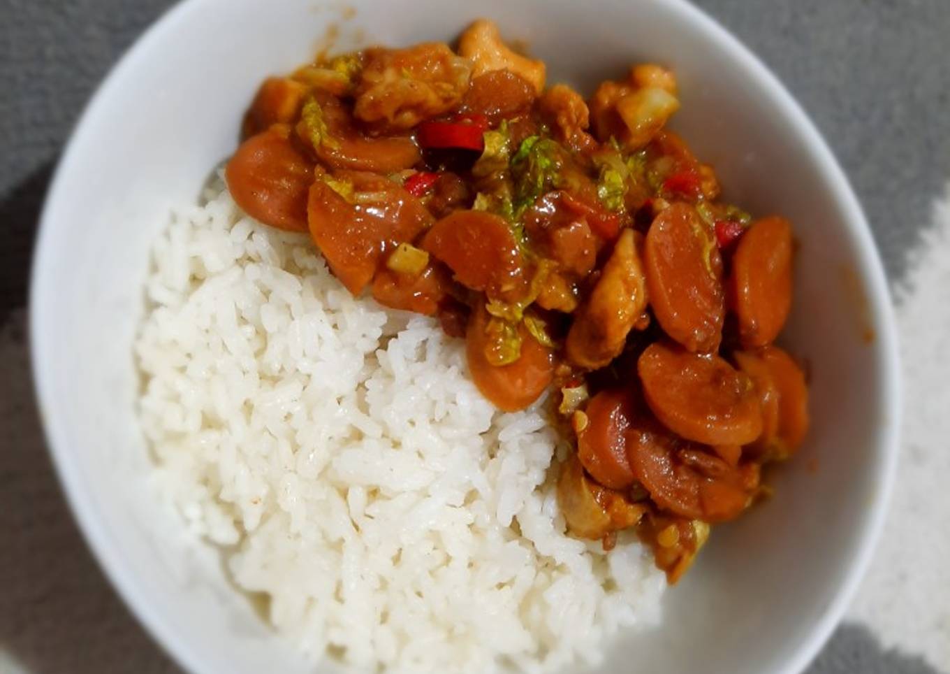 - Masukan ayam, sosis, kemudian kornet tunggu sampai ayam berubah warna kematangan
