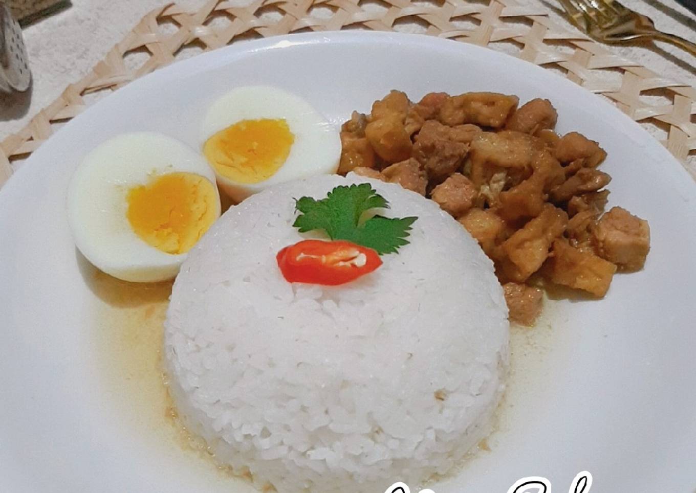 Tata nasi di piring, beri tumisan tahu ayam dgn pelengkap telur rebus dan irisan daun seledri. Siram dengan kuahnya. Sajikan kuah dalam keadaan panas. Enjoy,,,,๐๐